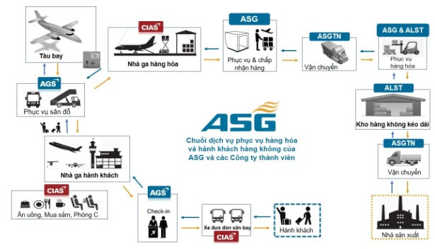 Như vậy, với sự góp mặt của CIAS, ASG đã trở thành Công ty mẹ của 04 Công ty: Công ty Cổ phần Dịch vụ Sân Bay Sài Gòn (ASGS), Công ty TNHH MTV ALS Thái Nguyên (ALST), Công ty TNHH ALS Thành phố Hồ Chí Minh (ALSH), Công ty Cổ phần Dịch vụ Sân bay Quốc tế Cam Ranh (CIAS) và 02 công ty liên kết là Công ty Cổ phần Dịch vụ Hàng không Sài Gòn (SACS), Công ty TNHH dịch vụ mặt đất Hàng không (AGS – Công ty con của CIAS).