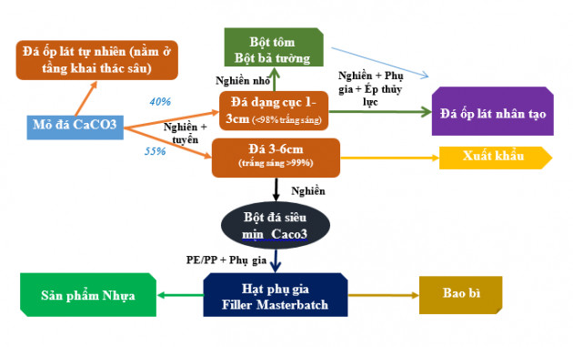 Phần phi lê là tầng khai thác thấp ( âm ~150m)cho đá khối hiện đang bán với giá từ 1.400-1.700$/m3 .Thịt bò thông thường là đá chips, bột siêu mịn được sử dụng xuất khẩu hoặc làm nguyên liệu đầu vào cho hạt Filler Masterbatch .Còn “bộ lòng” ở đây được hiểu là nguyên liệu sử dụng nhà máy sản xuất “hạt” CaC03 như đã nêu trên..