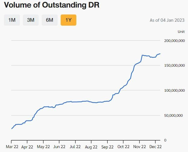 Tương tự, chứng chỉ quỹ DCVFM VN30 ETF cũng được dòng tiền từ xứ Chùa Vàng gom mạnh thông qua kênh DR. Đến ngày 4/1, lượng DR E1VFVN30 (E1VFVN3001) do Bualuang Securities phát hành đã lên đến hơn 246 triệu đơn vị, tương ứng giá trị vốn hóa 6,4 tỷ Bath (~4.400 tỷ đồng). Tỷ lệ chuyển đổi cũng là 1:1 đồng nghĩa với việc nhà đầu tư Thái Lan đang gián tiếp nắm giữ hơn 246 triệu chứng chỉ quỹ E1VFVN30. Đây cũng con số kỷ lục kể từ khi sản phẩm DR dựa trên chứng chỉ quỹ này ra mắt vào năm 2018.