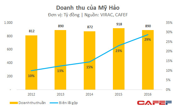 Tuy nhiên, trên thực tế nhãn hàng này đang có phong độ rất tốt. Số liệu từ công ty nghiên cứu VIRAC cho thấy, biên lợi nhuận gộp của Mỹ Hảo từ năm 2012 đến 2016 có sự thay đổi vượt bậc. Cụ thể, năm 2012, doanh thu thuần của Mỹ Hảo đạt 812 tỷ đồng, lợi nhuận gộp 81 tỷ đồng tương đương biên lợi nhuận gộp chỉ 10%. Nhưng qua các năm, tỷ lệ này liên tục tăng trưởng. Đến năm 2016, doanh thu thuần đạt 890 tỷ đồng thì lợi nhuận gộp lên tới 257 tỷ đồng tương đương biên lợi nhuận gần 29%.