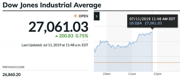 Chỉ số gồm 30 cổ phiếu lần đầu tiên trong lịch sử vượt mốc 27.000 điểm. Cụ thể, Dow Jones tăng 0,8%, tương đương 200 điểm.