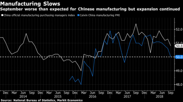 Bên cạnh đó chỉ số PMI sản xuất do Caixin thống kê (tập trung vào các doanh nghiệp tư nhân và có quy mô nhỏ hơn) cũng giảm từ 50,6 xuống còn 50 điểm, thấp nhất kể từ tháng 5/2017. Mức 50 điểm là ranh giới phân chia giữa tình trạng hoạt động sản xuất mở rộng hay suy giảm.