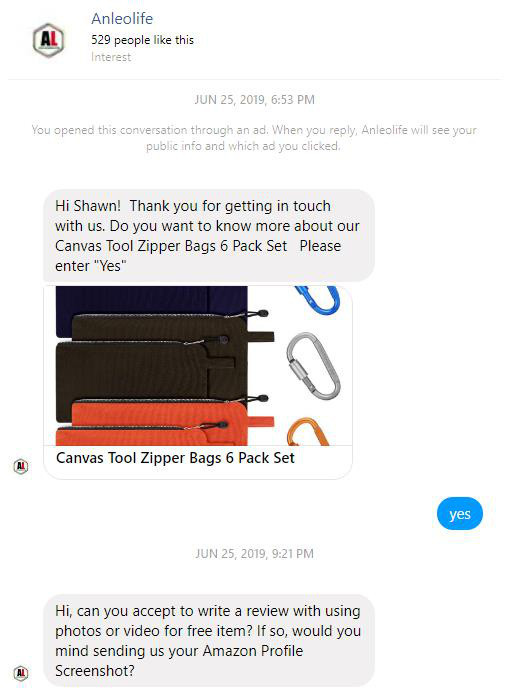 Vài giờ sau, page Anleolife nhắn tin hỏi liệu Smith có muốn viết review cùng ảnh hoặc video để đổi lại sản phẩm miễn phí không. Nhưng trước đó, người bán hàng yêu cầu Smith chụp hình profile trên Amazon để đảm bảo Smith đã từng viết review trước đó.
