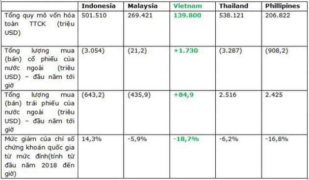 Theo VPBS, không giống một số quốc gia đang phát triển khác thuộc khu vực Đông Nam Á, Việt Nam vẫn cho thấy tình hình mua ròng trên cả 2 thị trường cổ phiếu và trái phiếu từ đầu năm 2018 đến thời điểm hiện tại. Các nhà đầu tư nước ngoài ghi nhận mua ròng hơn 1,7 tỷ USD trên thị trường cổ phiếu và mua ròng 84,9 triệu USD trên thị trường trái phiếu Việt Nam từ đầu năm 2018 cho thấy sự hấp dẫn tương đối của thị trường nước ta so với các quốc gia ASEAN đang phát triển khác.