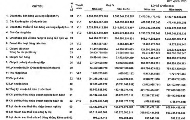 Lũy kế cả năm 2021 doanh thu đạt 7.064 tỷ đồng, giảm 11,3% so với doanh thu đạt được năm 2020 và mới thực hiện được gần 88% kế hoạch năm. Do chi phí tăng cao, nên lợi nhuận trước thuế đạt gần 462 tỷ đồng, hoàn thành 57% chỉ tiêu lợi nhuận được giao cho cả năm. Lợi nhuận sau thuế giảm 31% xuống còn 370 tỷ đồng.